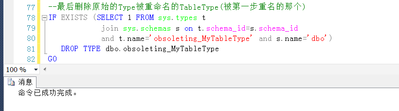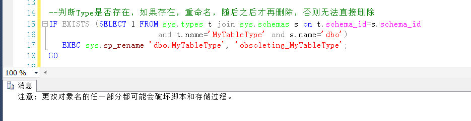 可以先將自定義的某個TableType重命名,重命名的過程中有一個警告,這里先忽略它,隨后可以直接Drop Type dbo.MyTableType