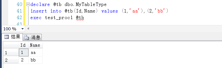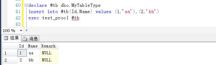 創建兩個存儲過程,分別用到了上面定義的用戶自定義表類型,模擬用戶自定義表類型被引用的情況