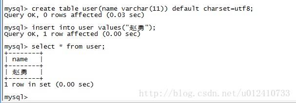 create table user(name varchar(11)) default charset=utf8;