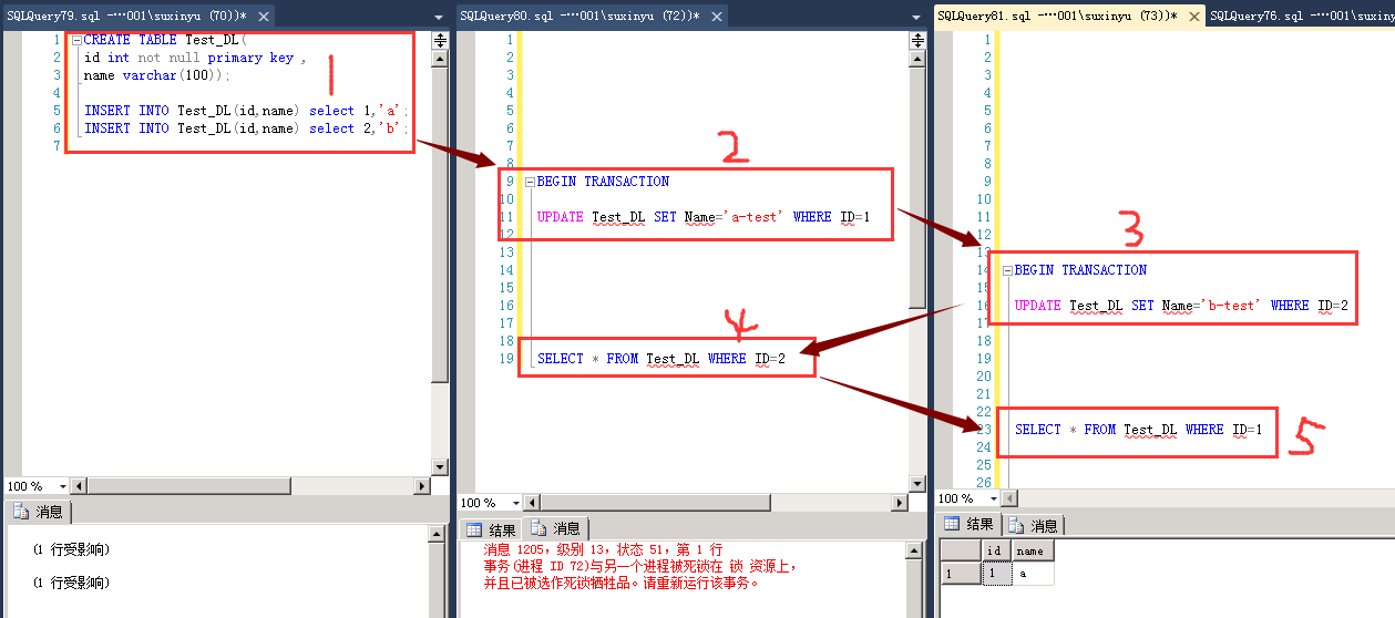 可以用一個萬年常用的例子來檢查是否監(jiān)控正常,開3個查詢窗口,按照以下順序執(zhí)行則會發(fā)生資源占用及申請互斥導(dǎo)致死鎖,執(zhí)行完第5步,等待1-3s則發(fā)生死鎖。腳本提供如下: