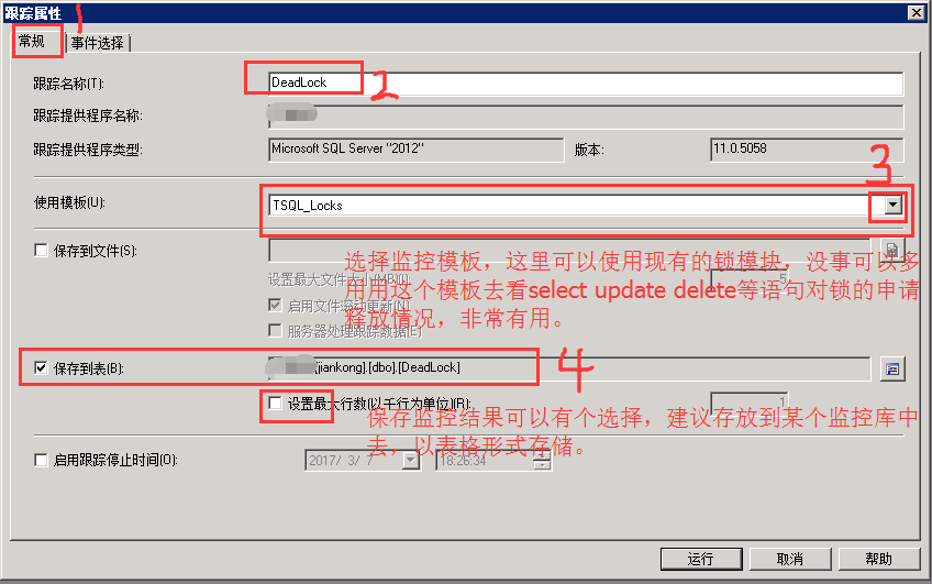 登錄到需要監(jiān)控的DB實例,填寫相應(yīng)的跟蹤屬性,首先是常規(guī)>頁面,如下圖。這里注意2個方面,第一,選擇 TSQL-Locks>模板,這個模板即可以用來監(jiān)控死鎖,也可以拿來觀察 鎖申請與釋放情況,非常詳細,有事沒事可以多拿來看SELECT UPDATE DELETE等語句對鎖的申請及釋放情況;第二,監(jiān)控結(jié)果存儲,建議可以存放到某個表格中去,方便定期分析與統(tǒng)計。