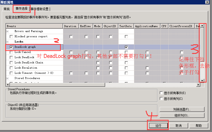 接著填寫事件選擇>項,只需要選擇 deadlock graph> Events,其他都不需要打勾,最后點擊運行就可以開始監(jiān)控了。