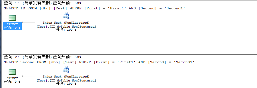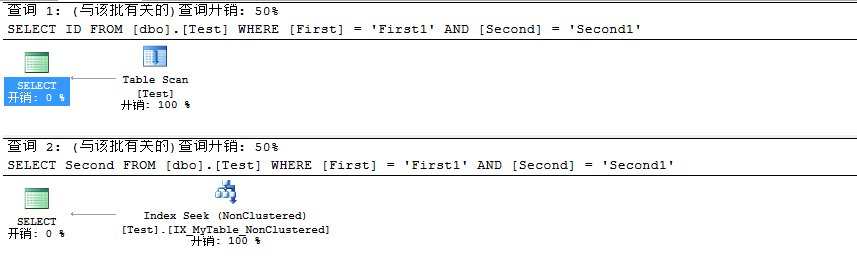 通過上述毫無疑問我們可以得出結論:查詢1是利用的全表掃描,而查詢2利用的非聚集索引查找。我們應該對于這個結論沒有任何懷疑,因為要第二個查詢的Second列在此之前已經創建額非聚集索引,而對于查詢1中的ID則沒有,所以會造成查詢1的全表掃描,而查詢2則是非聚集索引查找。