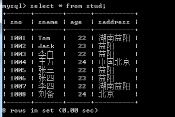 INSERT INTO stud VALUES('1001','Tom',22,'湖南益陽');