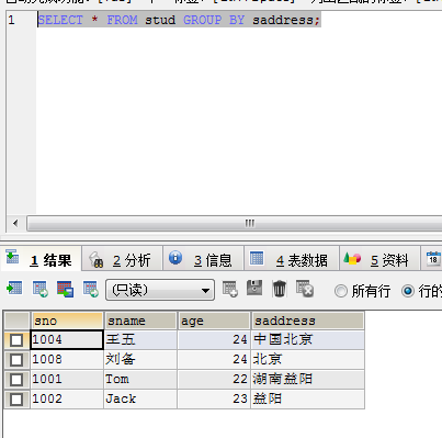 喎�"/kf/ware/vc/" target="_blank" class="keylink">vcD4NCjxwcmUgY2xhc3M9"brush:sql;"> SELECT * FROM stud GROUP BY saddress;