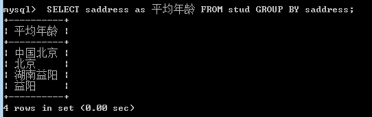SELECT saddress as 平均年齡 FROM stud GROUP BY saddress;