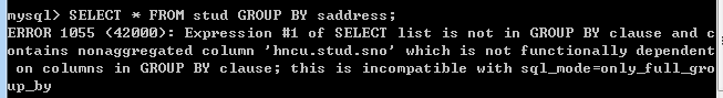 ERROR 1055 (42000): Expression #1 of SELECT list is not in GROUP BY clause and contains nonaggregated column 'hncu.stud.sno' which is not functionally dependent