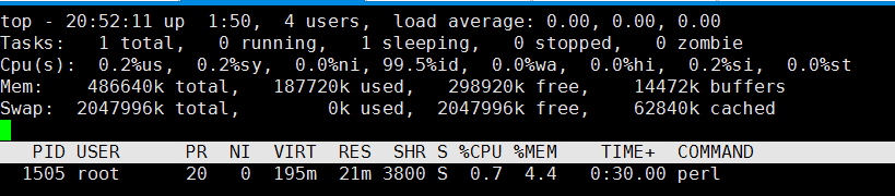 同樣CPU時間后,MEM增長到4.4%, 增長了1%,考慮到內存500M,該進程的內存占用增加了5M,雖然不是很多,但考慮到進程的內存增加并沒有停止的意思,這個現象還是要引起注意的。
