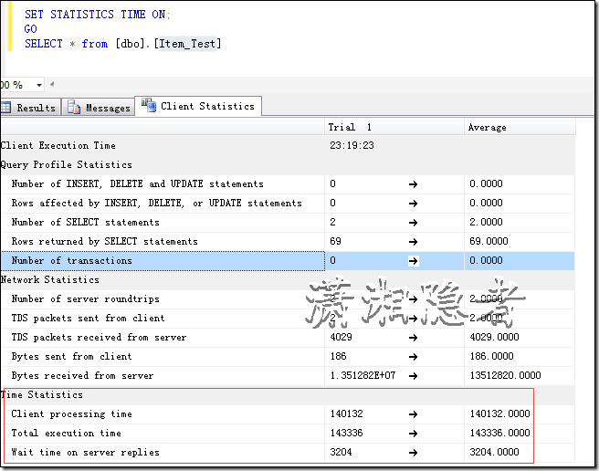 從客戶端發送的字節和從服務端接收的數據大小都很清晰、明了,那么數據從服務器端發送給客戶端所需的時間這里沒有,其實它基本上接近客戶端處理時間(Client processing time),我們也可以將客戶端處理時間權當網絡數據傳輸時間,從上面案例,我們可以看到這個時間耗費了140秒(140132 ms),可以肯定這個SQL性能慢在網絡數據傳輸上,而不是慢在數據庫那一塊(Server Processing Time).