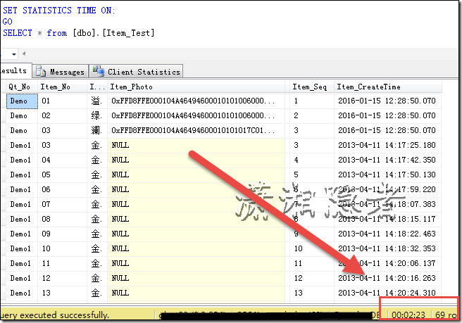 這個表有13800KB(也就是13M多大?。驗樵摫韺D片保存到數據庫(Item_Photo字段為iamge類型),這個是歷史原因,暫且不噴這種的設計??磥磉@個SQL執行時間長的性能問題不在于IO和SQL本身執行計劃是否有問題,而是在網絡數據傳時間上(服務器與客戶端位于異地,兩地專線帶寬6M,不過很多應用、郵件、系統都依賴此專線)