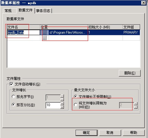 2)數據庫屬性對話框中,在常規選項卡中輸入數據庫名,然后在數據文件和日志文件中指定名稱和保存位置(建議把數據庫放在D盤),還可以指定數據庫的最大限額。