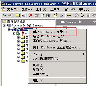 1)這種方法要求我們自己電腦上安裝了微軟的SQLServer軟件。打開開始菜單->程序->Microsoft SQL Server->企業管理器,依次展開Microsoft SQL Servers->SQL Server 組->(local),右鍵點擊SQL Server 組,再點擊新建SQL Server注冊。