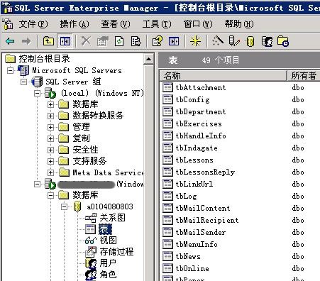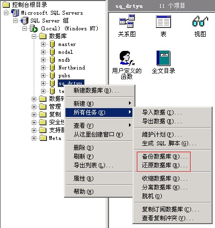1)打開開始菜單->程序->Microsoft SQL Server->企業管理器,依次展開Microsoft SQL Servers->SQL Server 組->(local)->數據庫,右鍵點擊數據庫名,選擇所有任務,再點擊還原數據庫。