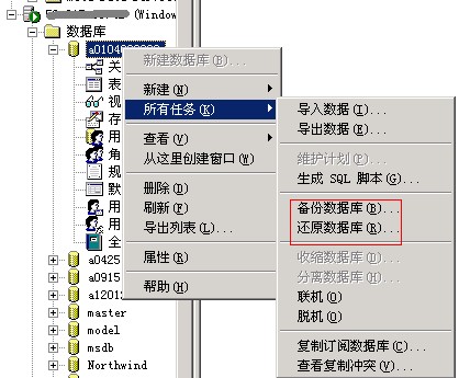6)接下來,右鍵點擊數據庫名,選擇所有任務,再點擊備份數據庫或還原數據庫。關于備份和還原的具體操作辦法,請看下面獨立服務器中的說明。