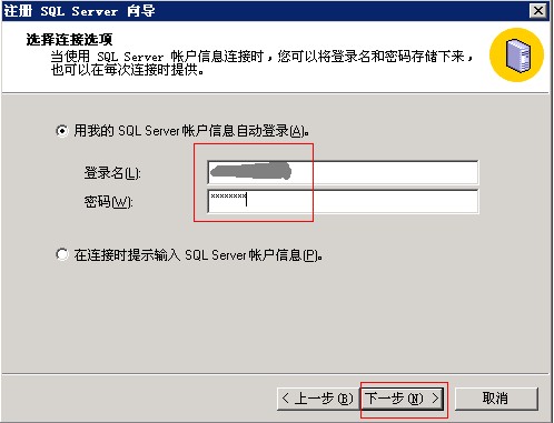 3)接下來選擇管理員給我分配的SQL Server登錄信息,再點擊下一步。然后輸入用戶名密碼,還是點擊下一步,最后點擊完成。