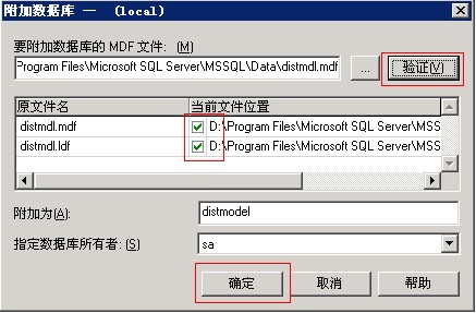2)然后輸入mdf文件的具體路徑,點擊驗證,看到下面出現兩個綠色勾的時候說明文件完整,然后填上數據庫名(附加為這項),再點擊確定,就附加成功了。