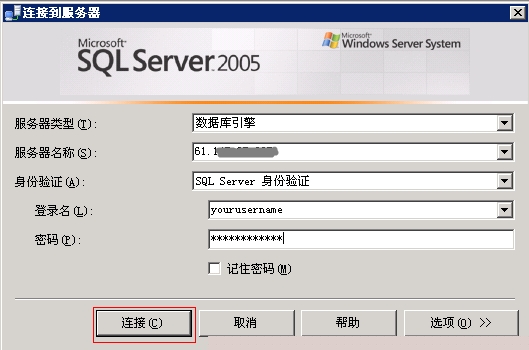 2)在服務器名稱上輸入IP地址,身份驗證選擇SQL Server身份驗證,然后輸入數據庫用戶名和密碼,點擊連接即可。后續步驟和SQLServer2000的類似。