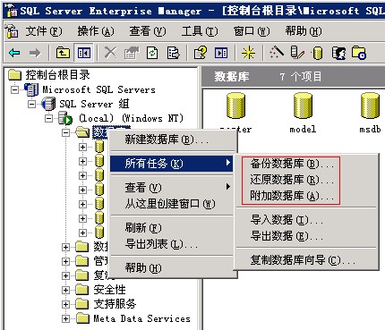 1)打開開始菜單->程序->Microsoft SQL Server->企業管理器,依次展開Microsoft SQL Servers->SQL Server 組->(local)->數據庫,右鍵點擊數據庫名,選擇所有任務,再點擊附加數據庫。