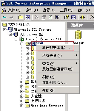 1)打開開始菜單->程序->Microsoft SQL Server->企業管理器,依次展開Microsoft SQL Servers->SQL Server 組->(local)->數據庫,右鍵點擊數據庫,再點擊新建數據庫。