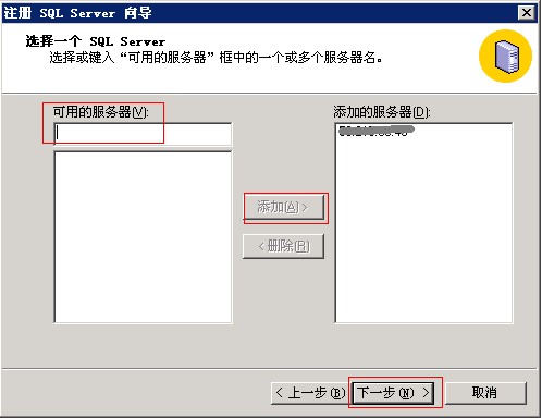 2)在注冊SQL Server向導中,點擊下一步。然后在可用的服務器下輸入數據庫IP地址,點擊添加,再點擊下一步。