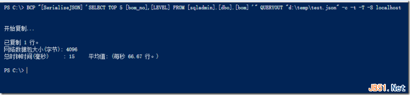 如果希望將SQL Server中數據導出為Json,雖然這種操作在應用程序里已經有非常成熟的方法,但SQL Server其實并沒有原生支持這種方式(小道消息,下個版本會支持)。我推薦使用這篇帖子的方式:https://www.jb51.net/article/61462.htm來做。將該帖子所提供的存儲過程建立完成后,使用如下BCP命令: