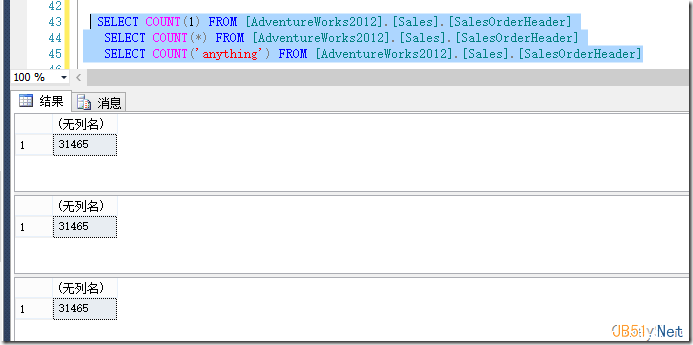 因此當你指定Count(*) 或者Count(1)或者無論Count(‘a(chǎn)nything')時結果都會一樣,因為這些值都不為NULL,如圖2所示。