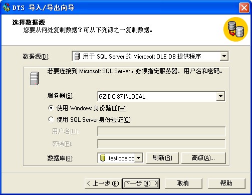 6、選擇數據源,輸入數據源所在的數據庫服務器名稱、用戶名、密碼和要復制數據的源數據庫,點擊“下一步”按鈕