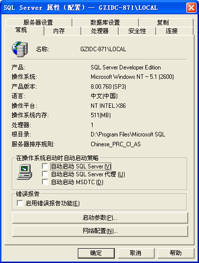 如何查看是否已打了SP3補丁呢?右鍵點擊本地SQL Server屬性,彈出圖16窗口,查看"產品版本"一行。