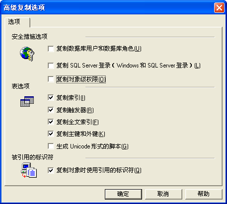 9、圖8中點"選項"后會彈出圖9,把"復制數據庫用戶和數據庫角色"與"復制對象級權限"兩個選項去掉,
