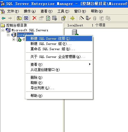 1、打開本地企業管理器,先創建一個SQL Server注冊來遠程連接服務器端口SQL Server。