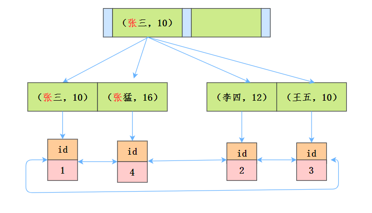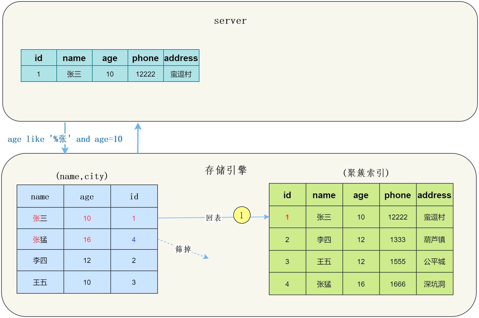 在MySQL 5.6之前,存儲引擎根據通過聯合索引找到name likelike '張%' 的主鍵id(1、4),逐一進行回表掃描,去聚簇索引找到完整的行記錄,server層再對數據根據age=10進行篩選。