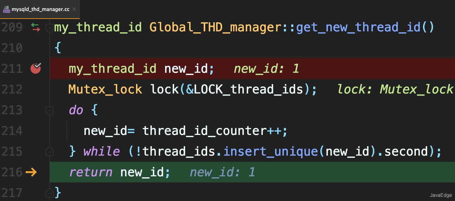 每新建一個連接,就將thread_id_counter賦值給這個新連接的線程變量new_id。