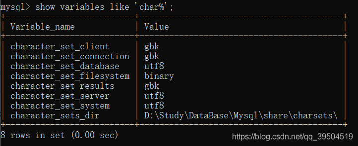 原因:cmd命令行默認使用gbk編碼,而set character_set_results卻為utf8。