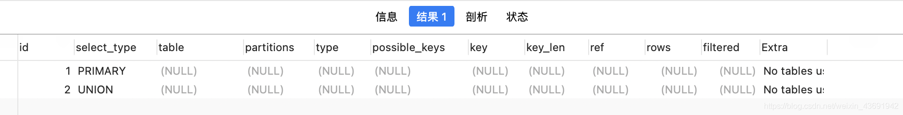 當有 union 時,UNION RESULT 的 table 列的值為union1,2>,1和2表示參與 union 的 select 行id。