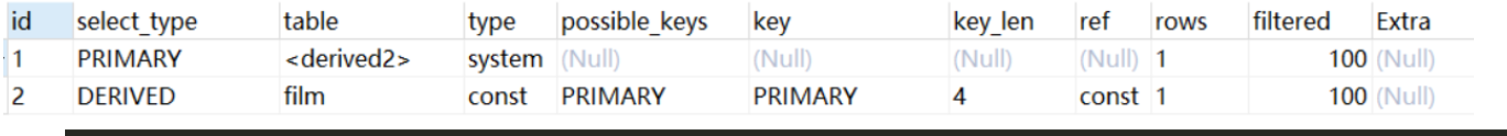2 explain select (select 1 from actor where id = 1) from (select * from film where id = 1) der;