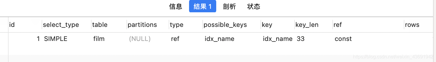 這一列顯示了在key列記錄的索引中,表查找值所用到的列或常量,常見的有:const(常量),字段名(例:film.id)