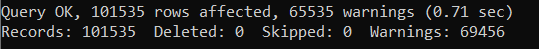 mysql>load data infile 'C:/ProgramData/MySQL/MySQL Server 8.0/Uploads/user_info_utf.csv' into table data.userinfo fields terminated by ',' optionally enclosed by '"' escaped by '"'lines terminated by '\r\n';