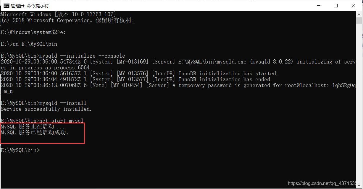 服務安裝成功之后輸入 net start mysql(啟動MySQL的服務) ,如下圖所示: