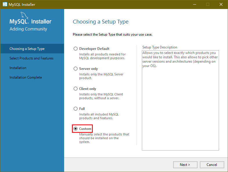 MySQL Installer安裝完成后進(jìn)入主頁面,為避免安裝過多不需要的組件,選擇Custom。