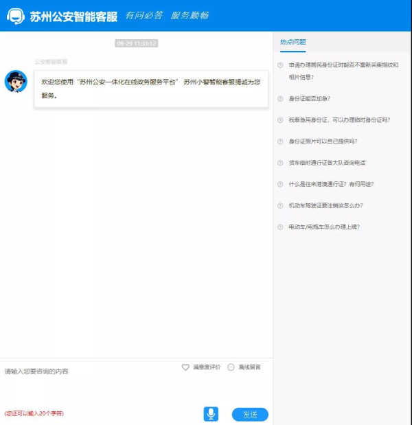 2020年,“蘇州公安一體化在線政務服務平臺”接到網上、電話咨詢10000多個,其中有70%的問題主要集中在辦理戶口、身份證、居住證、駕駛證等方面。由于熱線電話只有工作時間有人接聽,還常有占線等候的情況,網上咨詢平均2.5個工作日才能回復,效率較低。為了解決這一問題,切實把解決群眾的操心事、煩心事作為提升群眾辦事體驗感的著力點,蘇州公安結合“兩在兩同”建新功行動,從細微處入手推出政務服務“微實事”,在“蘇州公安一體化在線政務服務平臺”網頁端和“蘇州公安微警務”的掌上辦事欄目上線了蘇州公安政務服務“智能客服”。