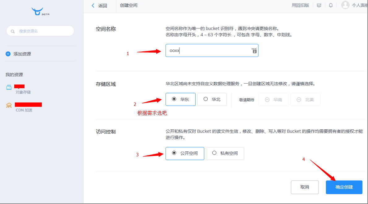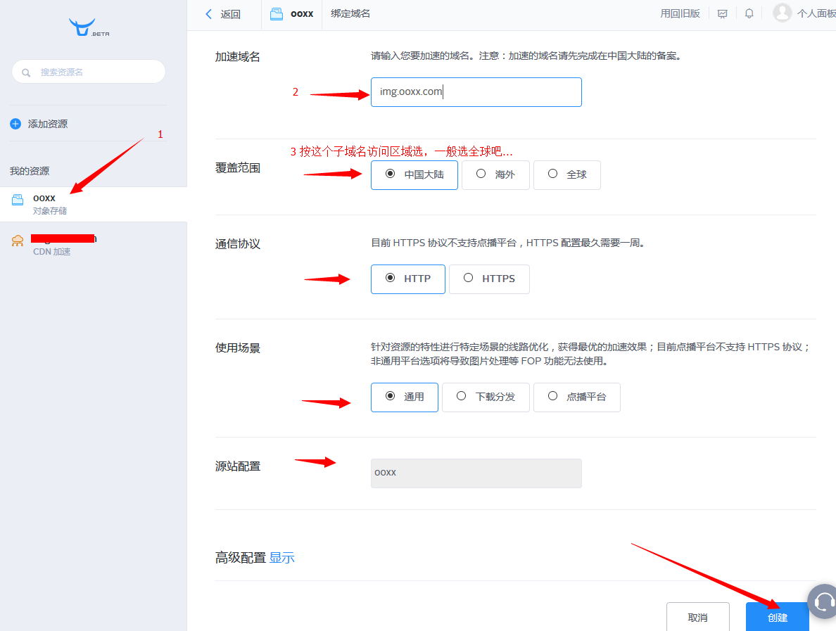 4.創(chuàng)建好后,就會在側(cè)邊欄“我的資源”顯示出來,如樣例中的是 ooxx(對象存儲),點(diǎn)擊它,然后參照下圖綁定域名(提示:不綁定也可以,可以用七牛提供的3級域名)