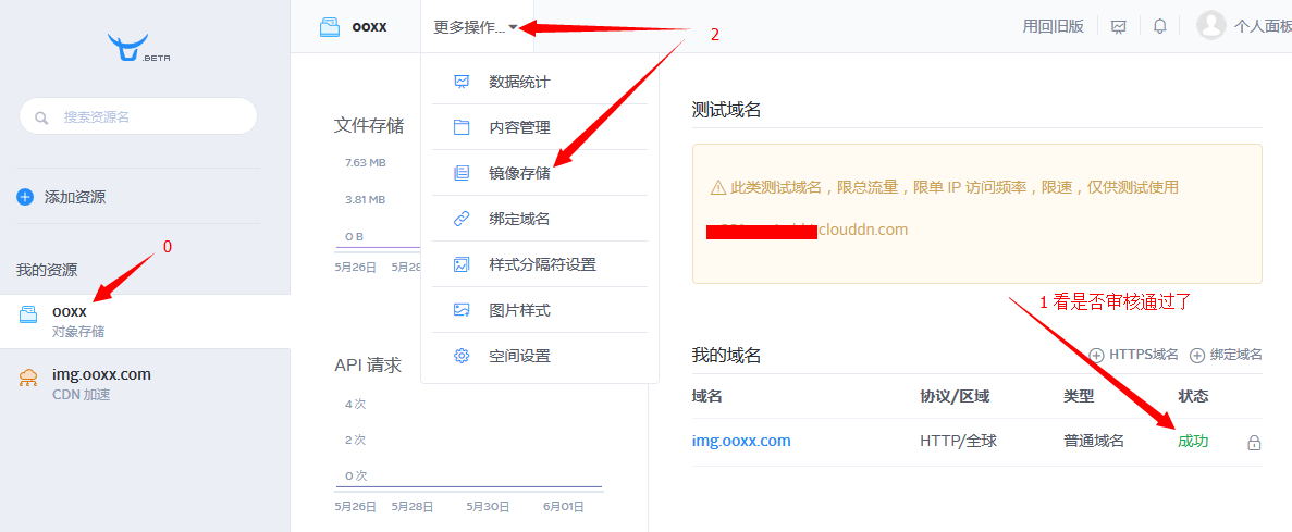 6.如下圖:0 點(diǎn)擊建立的對象存儲,1 看看是否通過審核了,2 如果菜單隱藏了,點(diǎn)擊“更多操作”,然后點(diǎn)擊“鏡像存儲”
