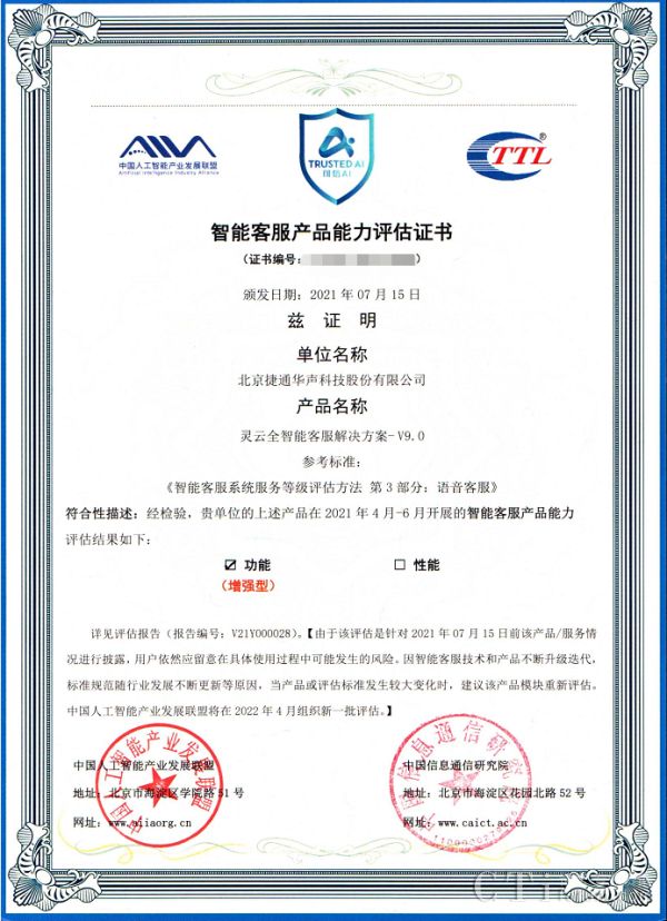 捷通華聲自主研發的“靈云全智能客服解決方案-V9.0”憑借過硬的技術實力以及貼合真實應用場景的強大服務能力榮獲“智能客服產品能力評估證書(功能-增強型)”