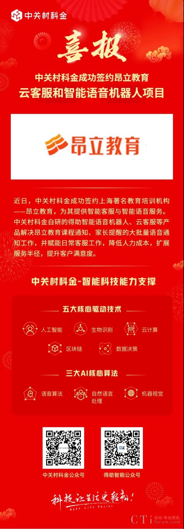 近日,中關村科金成功簽約上海著名教育培訓機構——昂立教育,為其提供智能客服與智能語音服務。