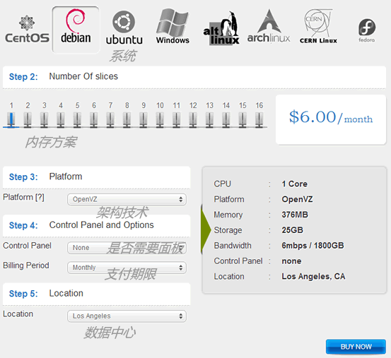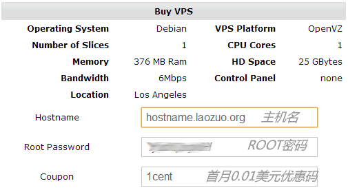 我這里選擇DEBIAN,因為我等會需要安裝LLSMP安裝包,我還是比較喜歡這個包的。然后我選擇376M內存方案,我只需要放幾個小博客使用,因為我需要選擇洛杉磯數據中心,所以只有OVZ架構技術的有。我采用月付方案,因為月付首月下面使用優惠碼只需要0.01美元,如果用的好以后續費只需要6美元/月,年付節省10%。