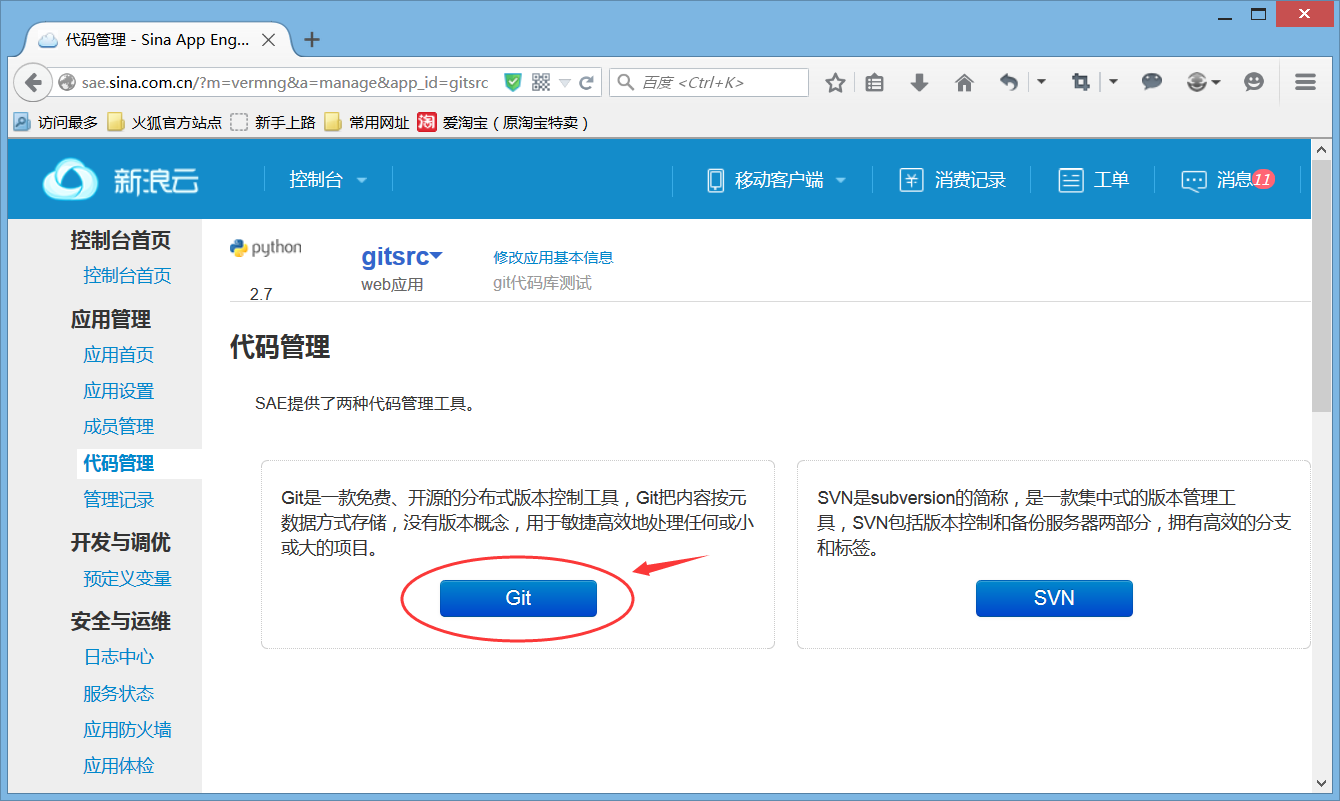 創建完成后,可以在頁面上看到應用的Git倉庫地址:https://git.sinaapp.com/gitsrc/