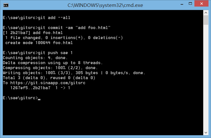 依次執行下面的語句,將變更提交至SAE Git代碼庫(分支版本1):