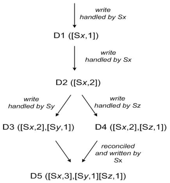 假設客戶端讀取數據,則會獲取到D3和D4,根據兩者的向量時鐘,會合并為D5和向量時鐘[(Sx, 2), (Sy, 1), (Sz, 1)],節點Sx協調寫操作,并更新對象和向量時鐘。