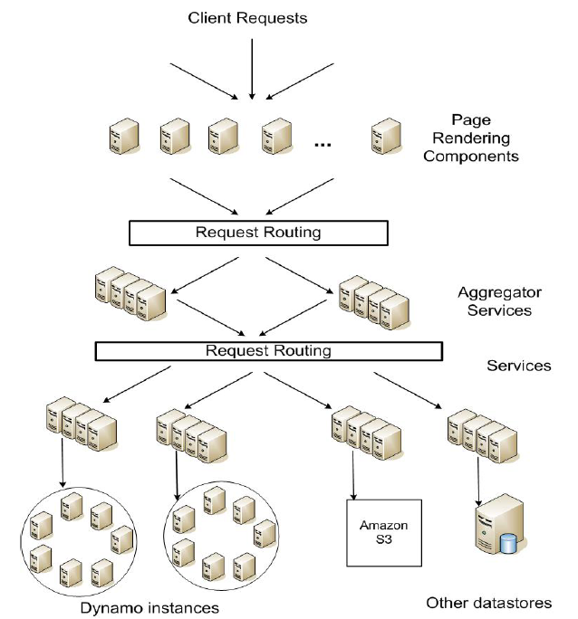 Amazon平臺是一個由數百服務組成的面向服務的架構,其秉承高度去中心化、松散耦合、完全分布式的原則,具體架構參考下圖。