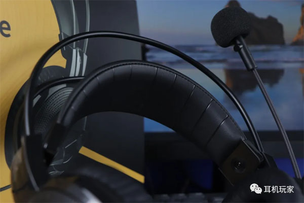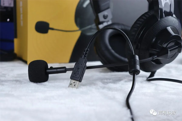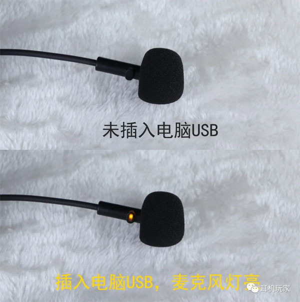 麥克風,和傳統電腦耳麥類似,置于耳機左側,可以上下擺動到自己合適的角度,內部軟性金屬可以自由調節靠近口部的距離。同時,在耳機插入電腦USB后,麥克風上的小黃燈就會亮起,表示開始待命。